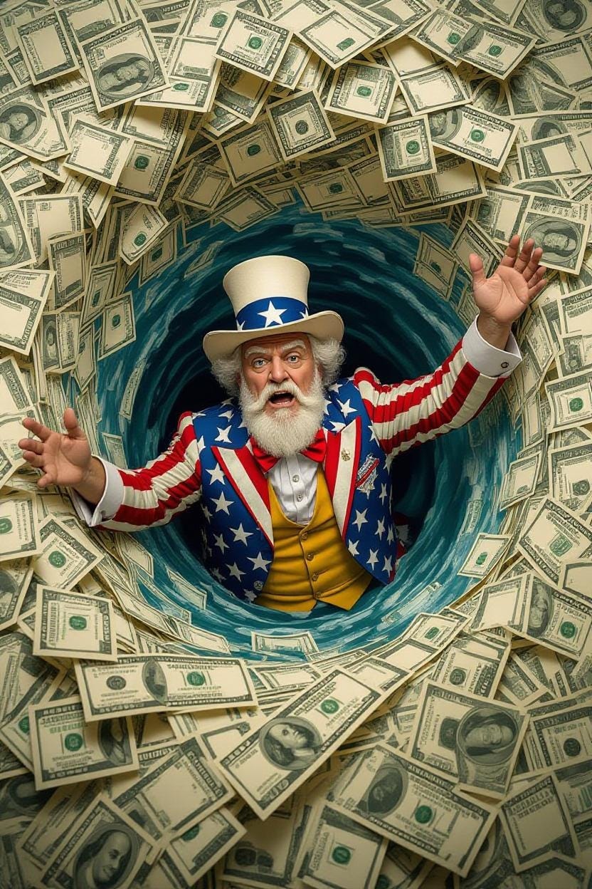 Grok插图:山姆大叔和美元欠条一起被冲进马桶。