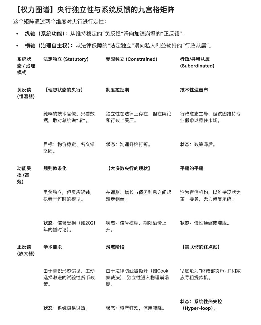 联储无限好,只是近黄昏「央行独立性」的神话时代已经结束,金融的未来更加动荡Light & Salt FinanceJan 22, 2026∙ PaidShare读者旁友们:经过此前几轮推送的深度拆解,我们从“斯大林格勒”式的正面围攻,讲到了美联储法律护栏的裂缝;从鲍威尔的“名誉救赎”,讲到了控制论下正反馈自毁螺旋。今天收官,洒家道破一个基本的定性判断:美联储独立性的黄金时代已成往事,系统进入一个“高烧,但尚未休克”的阶段,预后不妙。优质信息|准确认知|理性决策|有效行动|良好结果邮件组订阅年费人民币价格为999元(微信或支付宝);通过官网用PayPal订阅价格为126美元;介绍新人在官网订购邮件组,注册时务必要写对推荐人/您的电邮地址。订阅成功后您的订阅期限顺延三十天。Subscribe学习财经常识|提高财商险商|构筑风控防线|守卫财务安康Continue reading this post for free, courtesy of Light & Salt Finance.Claim my free postOr purchase a paid subscription.PreviousNext